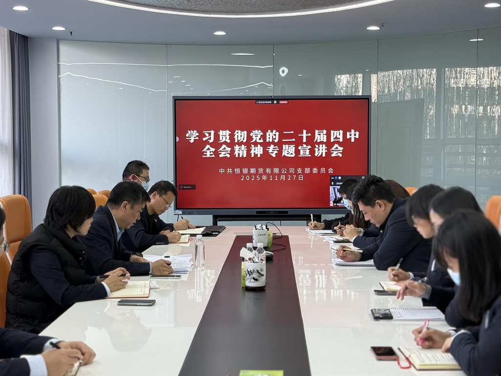 2025年11月27日,恒銀期貨有限公司在總部會議室設立主會場,召開學習貫徹黨的二十屆四中全會精神宣講報告會。河北國富投資副總經理、恒銀公司黨支部書記、董事長李剛作專題宣講,公司全體黨員和積極分子現場參會,公司外地黨員及從業(yè)人員通過線上會議同步學習。